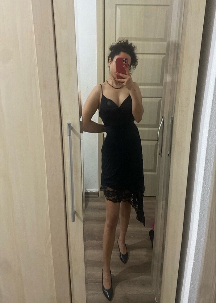 TRANSPARAN DANTEL DETAYLI ASIMETRIK SATEN ELBISE