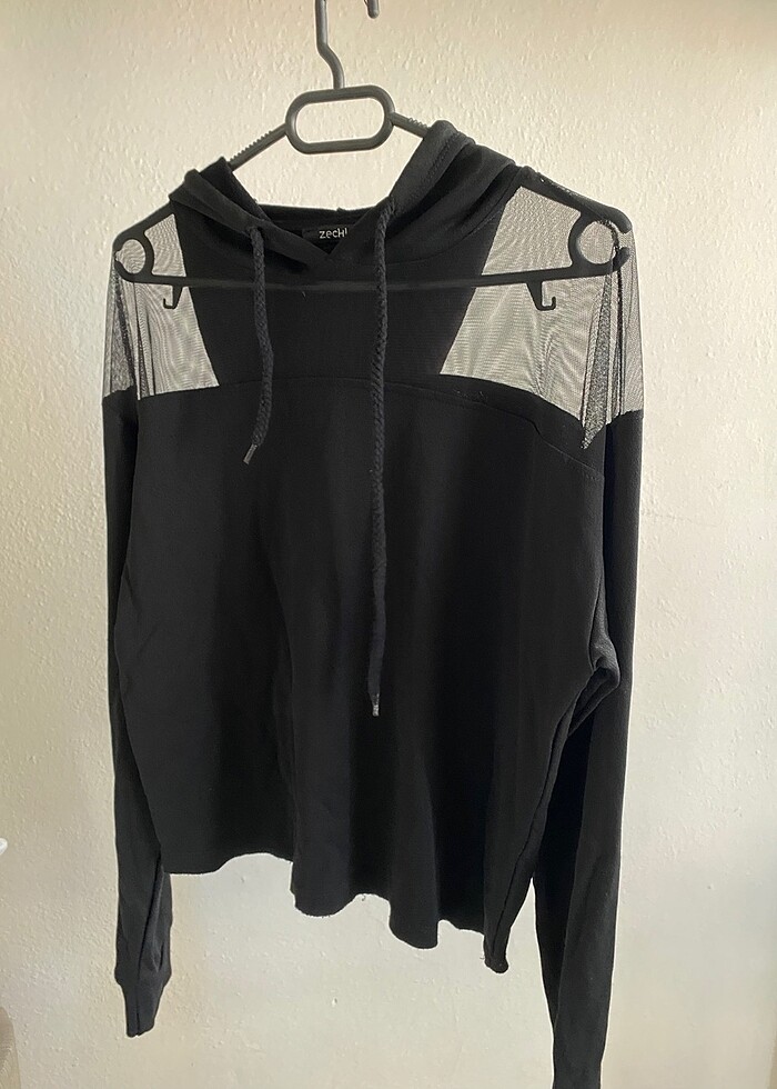 Bu ürün L beden olmasına rağmen hafif kalıbı dar. Üst kısmında transparan bir detayı var. Ek olarak kapüşonlu. İnce bir kumaşa sahip. Herhangi bir problemi yok.