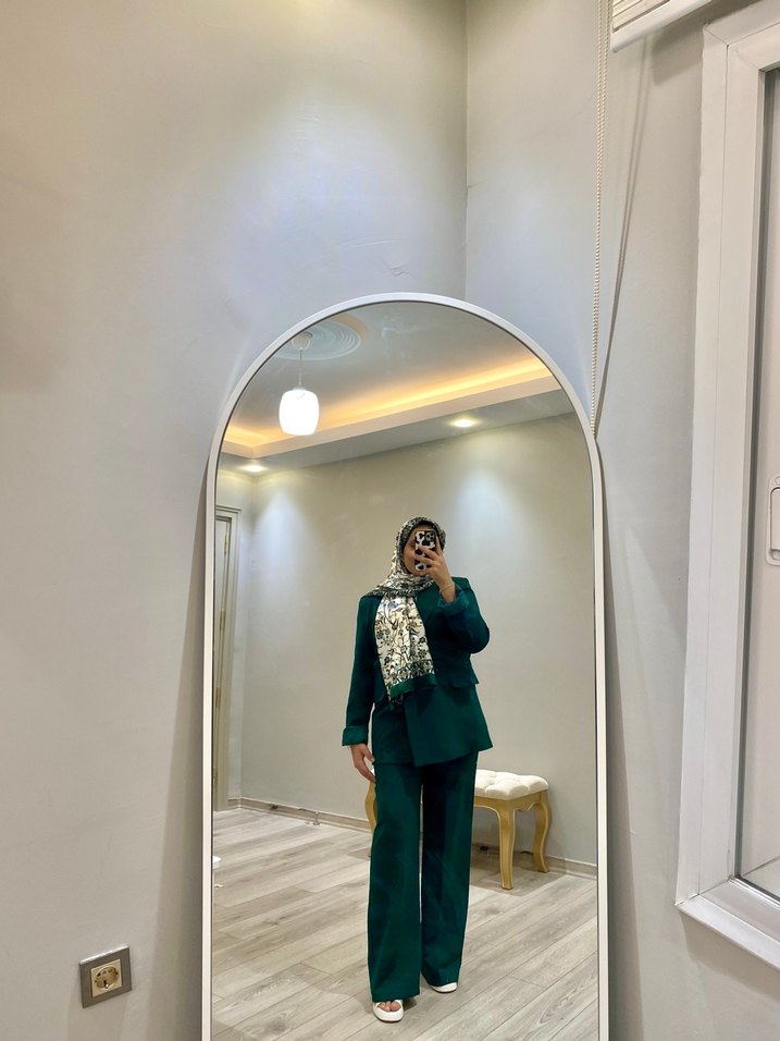 İnce yeşil renkte, ipeksi dokulu ve batik desenli kadın takımı. Transparan detayları, uzun boyu, kesik yaka ve uzun kollu tasarımıyla klasik ve zarif ofis stili sunar.