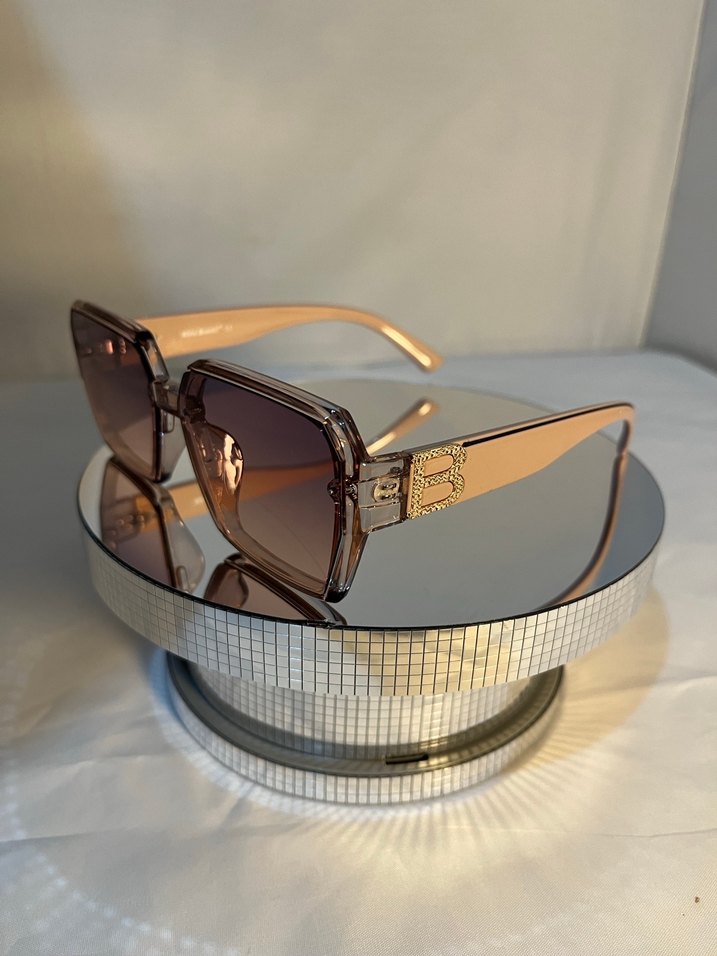 Parlak kahverengi,hafif pembe,şeffaf çerçeveli, çağdaş kare tasarımlı kadın güneş gözlüğü, zarif detaylarla süslenmiştir. ️