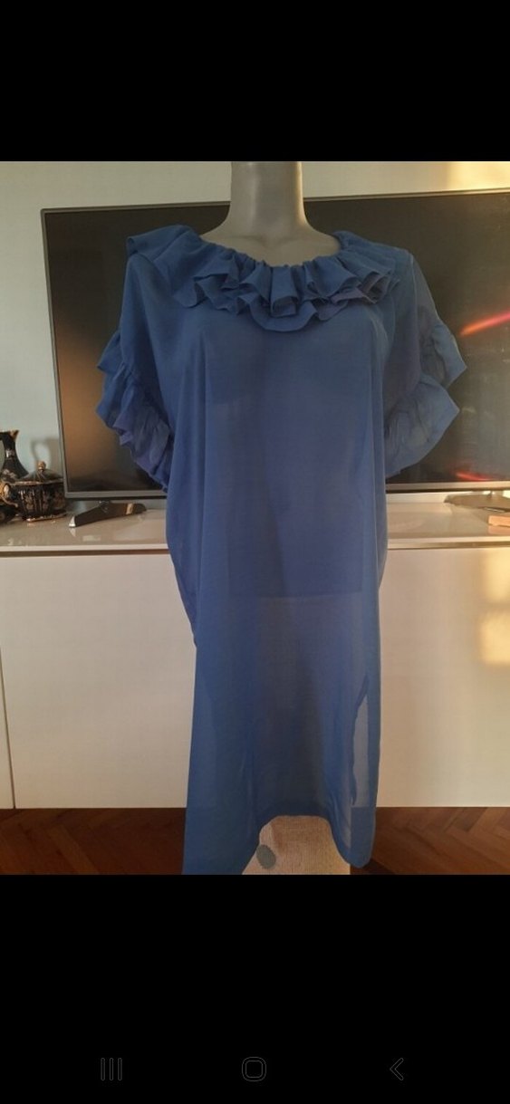 Uzun, bol kesim mavi tunik, tekne yakalı ve kısa kolludur, fırfır detayları bulunur. İpeksi kumaştan yapılmıştır,transparandir ve özel dikimdir.baskılı ve bohem tarzda günlük kullanıma uygundur. iki kol arası 54cm,boyu 85cmdir.marka temsili.
