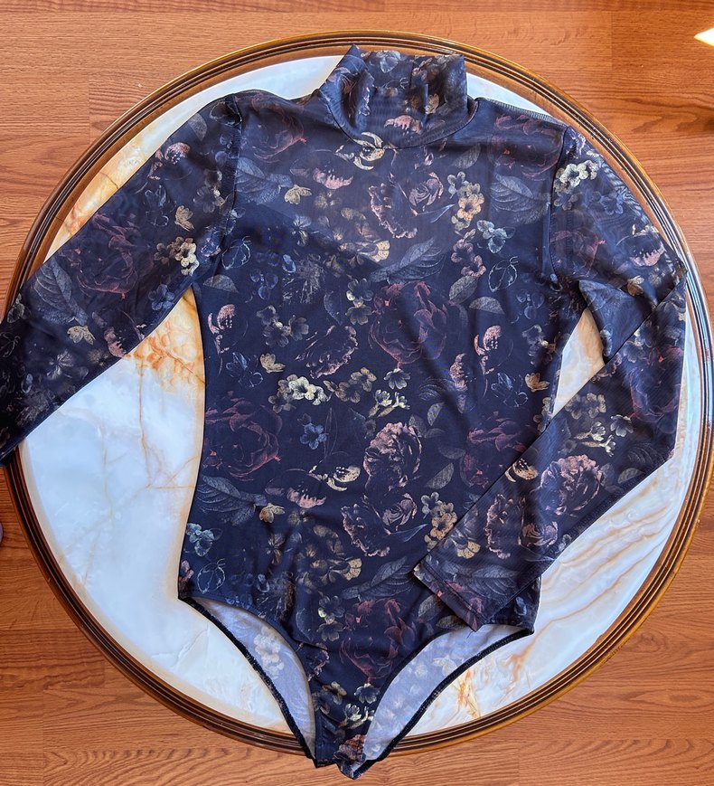 Yarım boğazlı ve uzun kollu bu lacivert bluz, vintage desenlere sahip. Sıkı kesimli, midi uzunlukta ve yumuşak sentetik transparan kumaştan üretilmiştir. Alt kısmı çıtçıtlı body