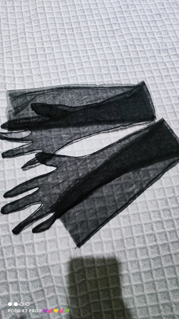 Şeffaf sentetik kumaştan tül detaylı siyah gotik kadın eldivenleri, karanlık ve avangart bir tarz sunar.