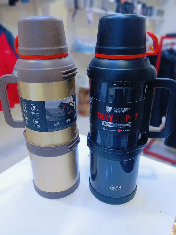 Gri ve siyah sarı renk seçenekleriyle, kulplu ve güvenli kapaklı termos şişeleri. İçecekleri sıcak veya soğuk tutar.