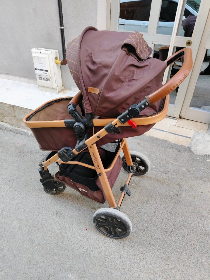 Ayarlanabilir tente ve saklama sepeti bulunan koyu kahverengi bebek arabası, rahat tutacak ve sağlam tekerleklerle donatılmıştır.