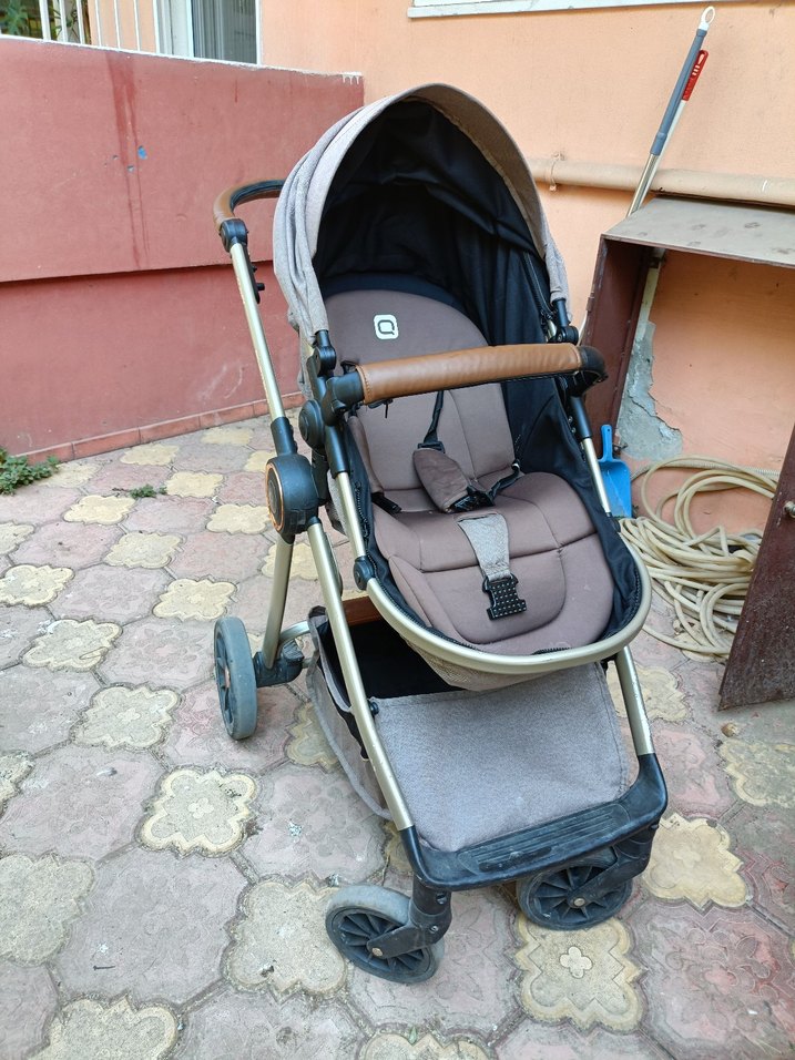 Gri çerçeveli, kahverengi yastıklı oturma alanı ve koruyucu tenteye sahip bebek arabası. Emniyet kemeri ve alt kısmında saklama sepeti bulunur.