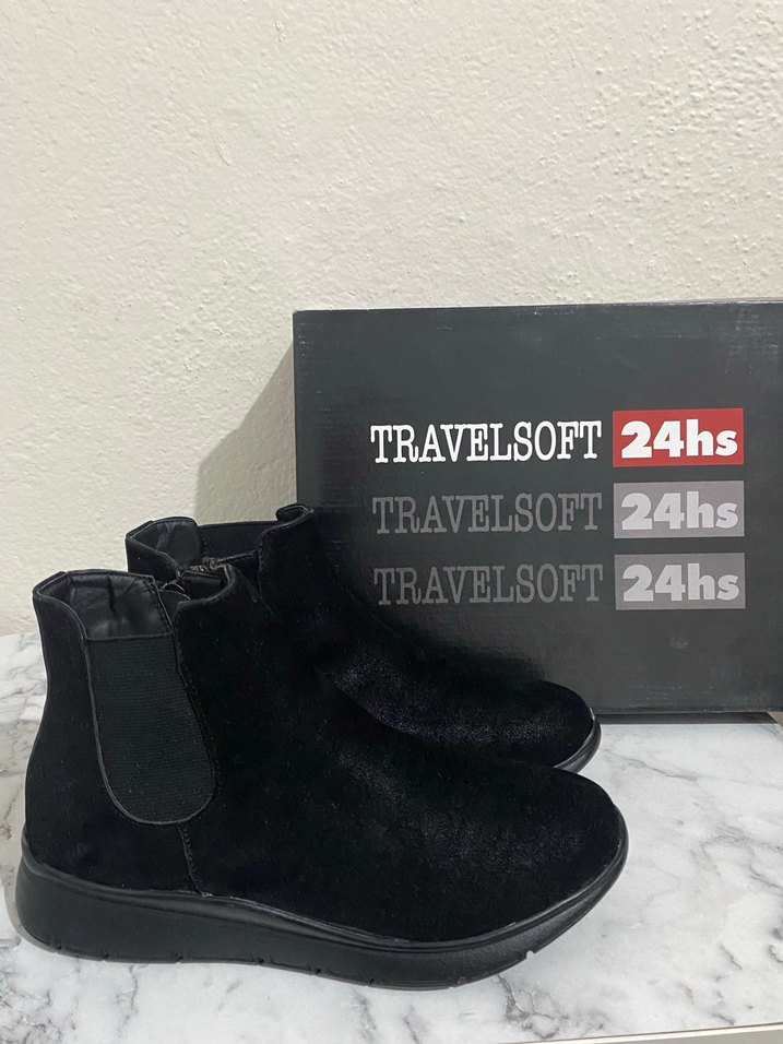 Siyah süet kadın botlar, dolgu topuklu ve tüy detaylıdır. Yumuşak iç yapısıyla rahatlık sunar. Günlük sokak stili için elastik yan bantlı ve baskılıdır. TRAVELSOFT 24hs markalıdır.