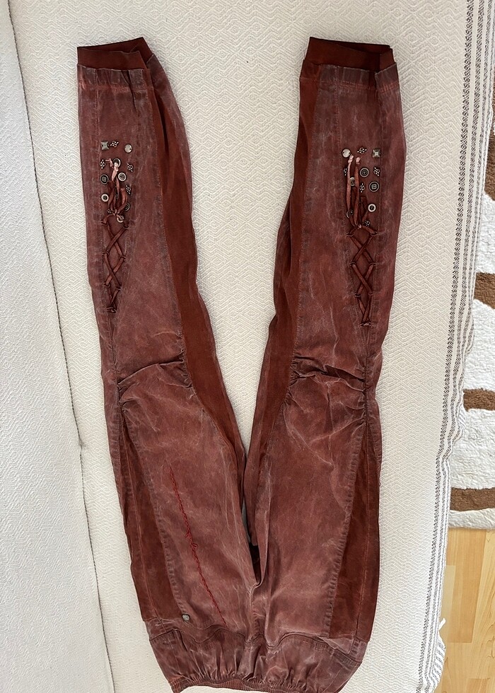 Görüldüğü gibi bel esnetilmiş hali 45 cm fotolara bakıp alınız yırtık sökük leke yoktur iade almıyorum renk kiremit kahve arası bi renk