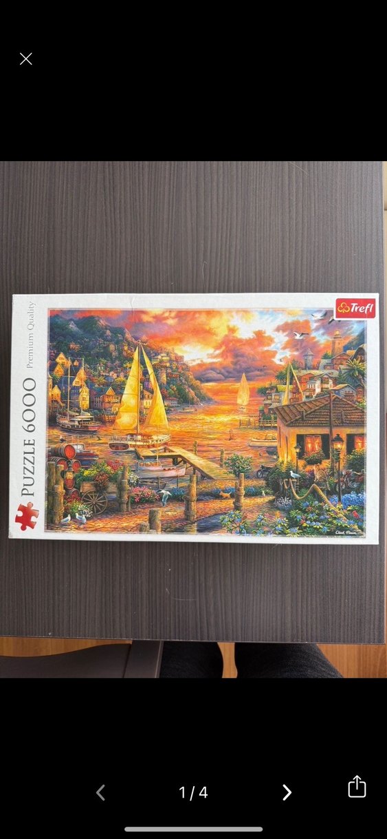 Trefl markanın 6000 parçalı renkli puzzle'ı, yelkenliler ve günbatımı sahnesi ile sıcak altın tonları sunar. iki pakete bölünüp paketlenmiş sadece bir paketi açıp 2-3 gün sonra kaldırdım eksiği yoktur..pazarlık payı bıraktım :))