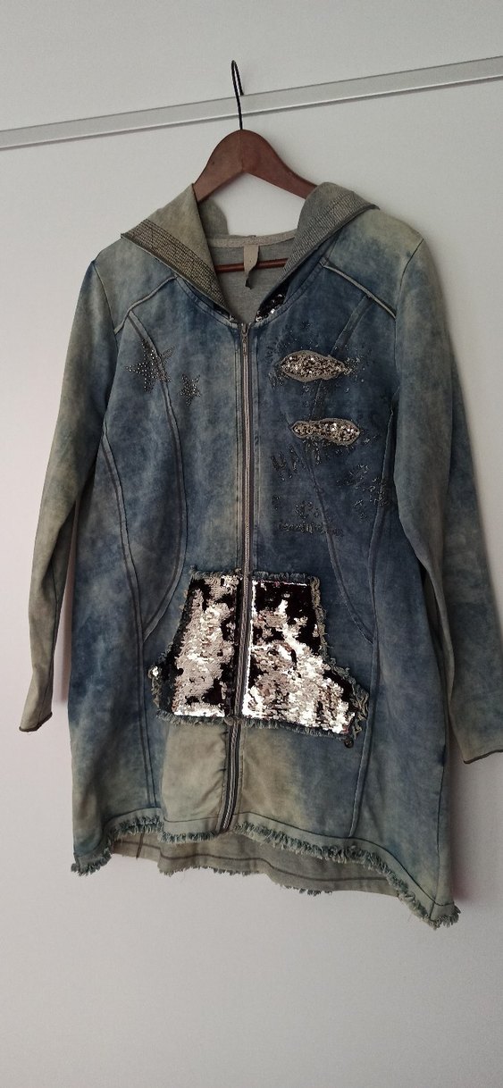 hiç kullanılmamış çok şık kot ve pul süslemeli kapüşonlu trençkot mağaza fiyatı 1200 TL