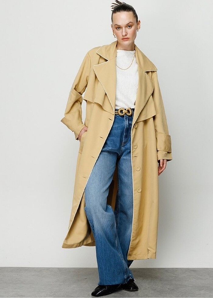 Hooopstore marka 2023 sezonu yani geçen sene almış olduğum bir trençkot. Çok iyi durumda,çok sık giyilmedi oyüzden yepyeni. 40 beden yaka kenarları beyaz biyeli