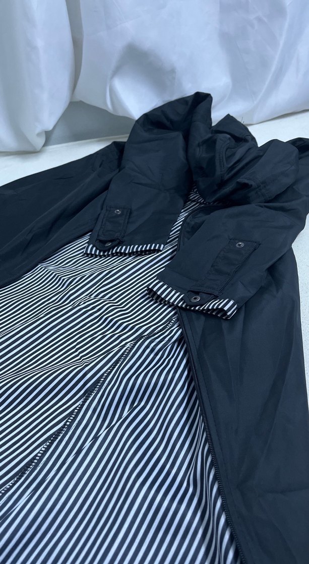 İçi çizgili dışı düz siyah yağmurluk/trençkot. Defosu yoktur. Şapkalıdır. Yaşadığım şehirde bir butikten aldım. Artık giymiyorum bu yüzden satıyorum.