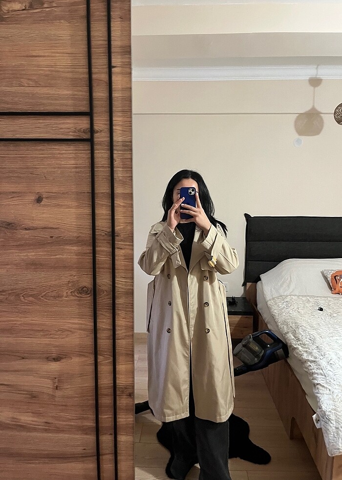1 kere giydim. s-m uygun. Kumaşı aşırı tok harika bir trenç fakat benim omuzlarım kastı oversize giydiğim için rahat edemedim. Alana hayırlı olsun. Tüm samimiyetimle söylüyorum asla pişman olmaz. kalitesi muhteşem
