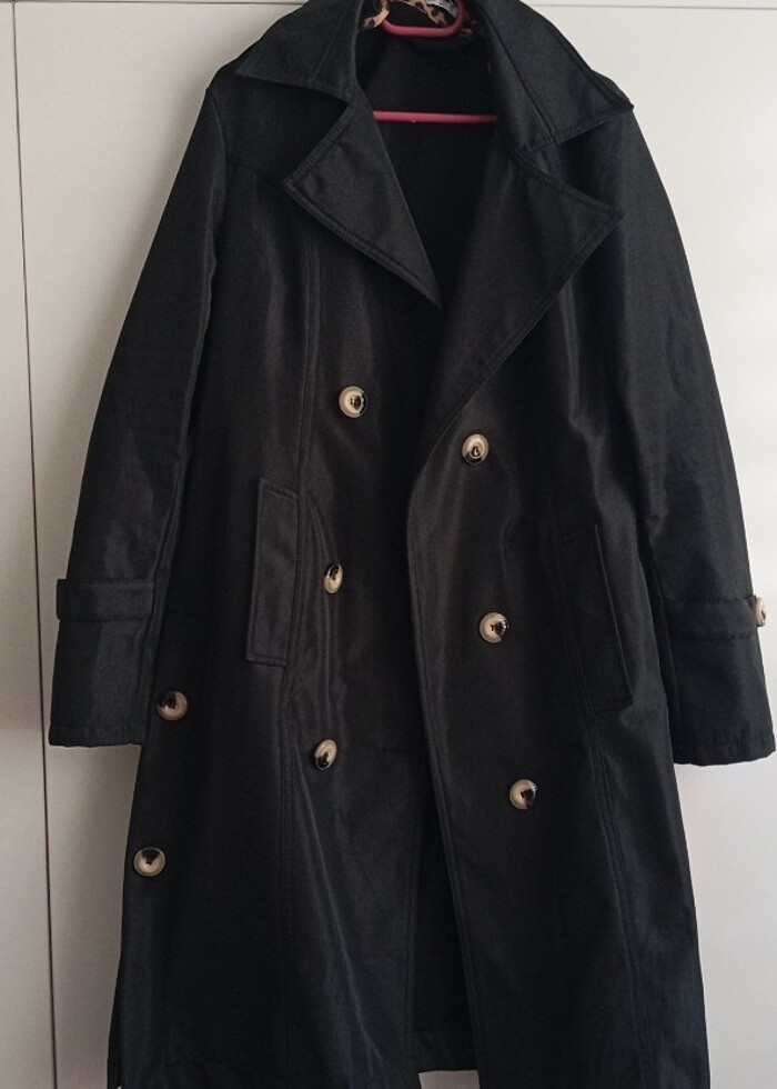siyah trençkot boyu omuzdan aşağı 100 cm göğüs ölçüsü 40 cm hiç kusuru deforma yoktur temiz yepyeni bir kaç kez giyildi