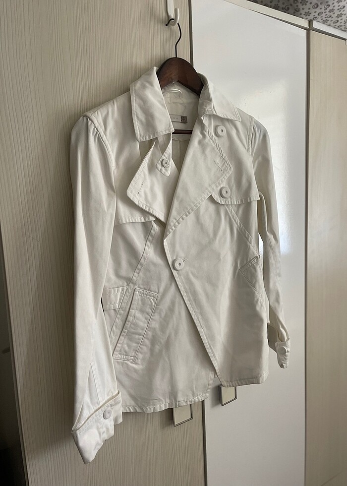Sayılı kullanıldı.yeni temizlettirmiştim ama kızım istemedi.pamuklu kumaş.sadece yakada hafif sarılık var belli belirsiz.#pardesü #trençkot #beyaztrençkot