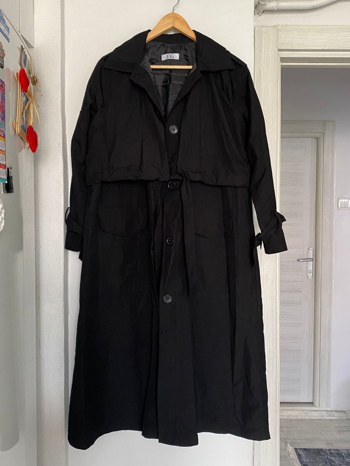 Esma Gönöz marka 40/42 beden uyumlu tasarım model önden bağlamalı astarlı arkası yırtmaçlı kolları bağcıklı çok şık trençkot rengi siyahtır ışıktan dolayı soluk çıkmıştır Yeni gibi tertemizdir .