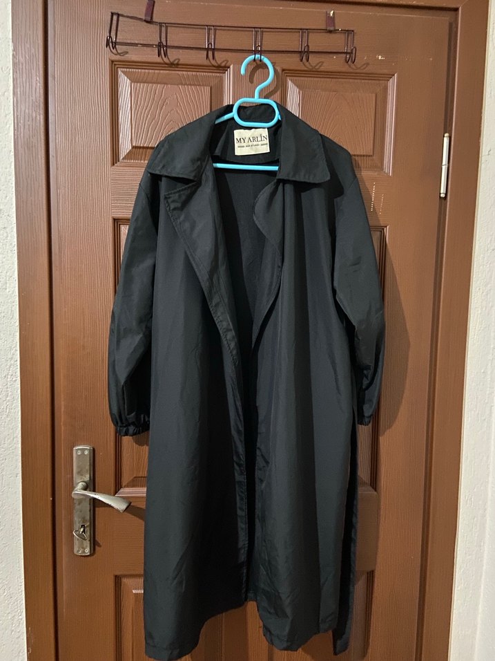 düğmesiz trençkot isterseniz diktirebilirsiniz birkaç kere giyildi sorunsuz cepleri vardır kuşağı da mevcut