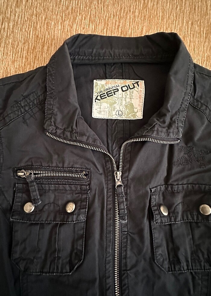 Sonbahar, bahar ve yaz akşamlarında kullanıma uygun KEEP OUT marka kısa L beden astarsız pamuk siyah trençkot/mont kilo alımı nedeniyle az kullanılmıştır. Herhangi bir sorunu yoktur. Boy 63 cm, omuz 40 cm, koltuk altı 53 cm, etek çevresi 115 cm, kol boyu 60 cm
