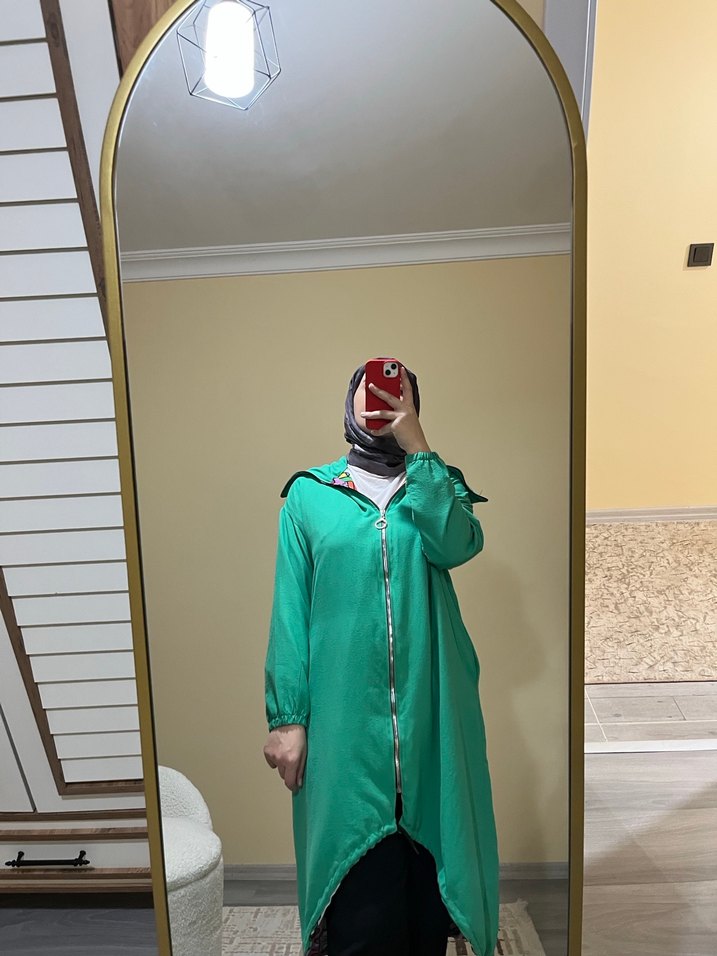 bol kesim ve dökümlü açık yeşil uzun yağmurluktur. günlük sokak stili için uygundur. Defosuz 1 2 kez giyildi ☔ M L beden uyumludur .