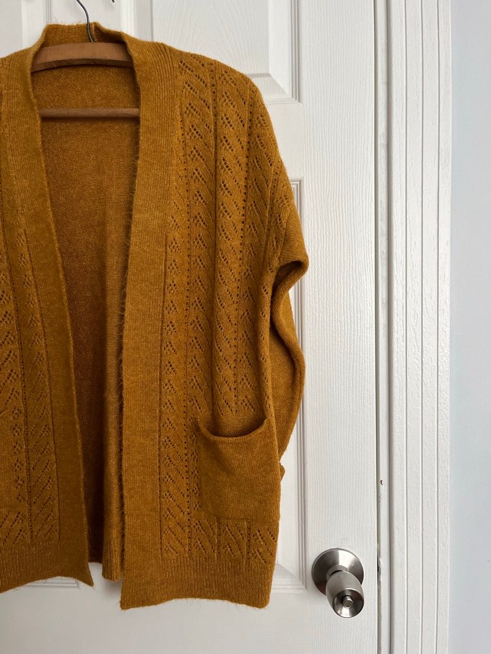 BEDENSİZ • Stil: Oversize/Rahat kesim, önü açık model. • Renk: Canlı hardal/bal rengi (Sonbahar/Kış trendi). • Detay: Önünde cepleri bulunan, delikli (ajurlu) örgü desenli şık bir tasarım. • Malzeme: Yumuşak ve sıcak tutan, kalın örgü kumaş. • Kombin: Basic tişörtler, elbiseler veya boğazlı kazaklarla harika durur. Katmanlı giyim için idealdir.