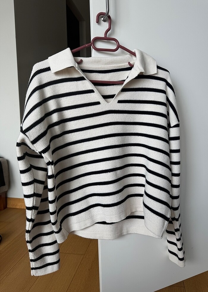 Her dolaba lazım basic bir parça! Siyah-beyaz çizgili bu triko kazak, polo yaka detayı ve rahat kesimiyle hem şık hem de konforlu. Jean, etek ya da şortlarla harika kombinlenir. Az kullanıldı, temiz ve yumuşak dokulu.
