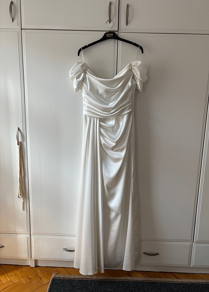 Beden: 38 (Etikette 3 yazıyor, tam kalıptır. 36-38 arası giyenler için uygundur.) Kumaş: Saten görünümlü akışkan kumaş (iç göstermiyor, astarlıdır) Renk: Krem / Kırık beyaz Durum: Sadece 1 kez nişanımda giyildi Kusur: Etek ucunda ve birkaç noktasında hafif leke izleri mevcut (fotoğraflarda detaylı gösterildi). Kuru temizlemeyle çıkarılabilir. Elbise arkadan fermuarlıdır ve vücuda tam oturur. Duruşu çok şık, özellikle drapeleri ve kol detayıyla fotoğraflarda harika çıkıyor!