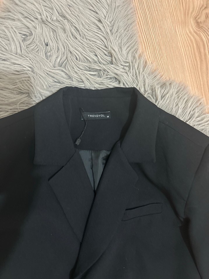 TrendYol marka siyah, normal kesim, uzun kollu kadın blazer belden bağlamalı ceket.