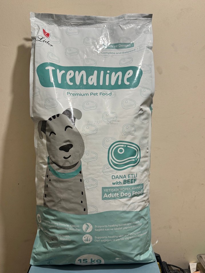 Trendline dana etli yetişkin köpek maması, sağlıklı kemik ve dengeli beslenmeyi destekler. 15 kg paket halinde sunulur.