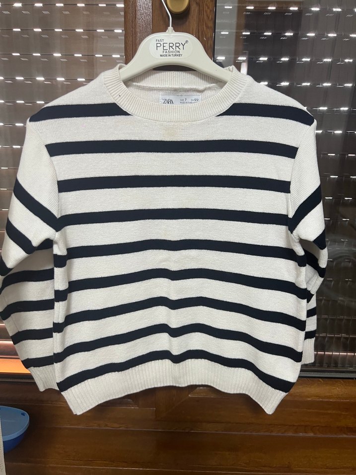 Fotoda belirtilen minik bir sararma var .(cikabilir belki)Uzun kollu, yuvarlak yaka, çizgili beyaz ve gri triko