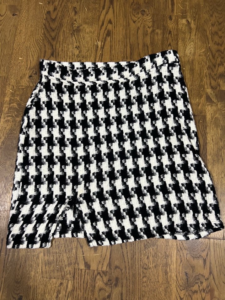 Trendy, rahat dokulu sentetik kumaştan örme, koyu renkli kareli desenli mini etek, günlük ve sokak stiline uygun. S beden bir kez giyilmiştir