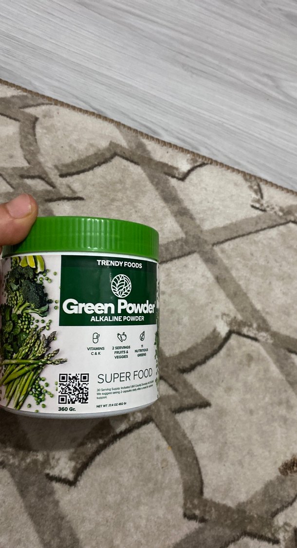 Trendy Foods Yeşil Alkalin Toz, C ve K vitaminleri, meyve ve sebze porsiyonları ile antioksidanlar içerir. 360 gramlık kutuda sunulur. Diyet için