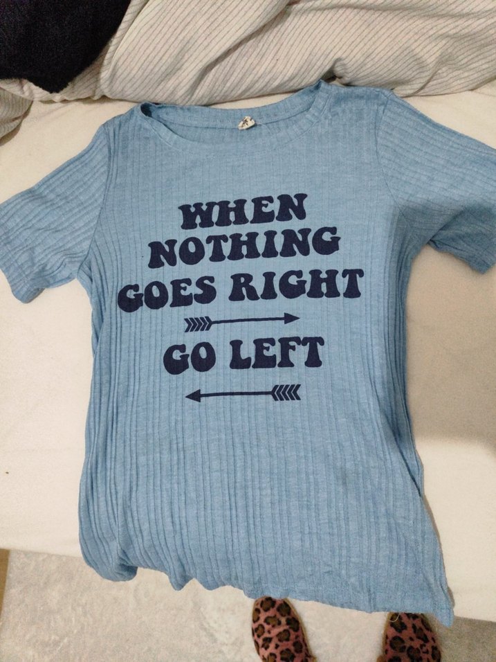 Mavi, bol kesim uzun kollu tişört. Önünde yazılı baskı ve örme dokusu bulunur, günlük rahat kullanım için uygundur.