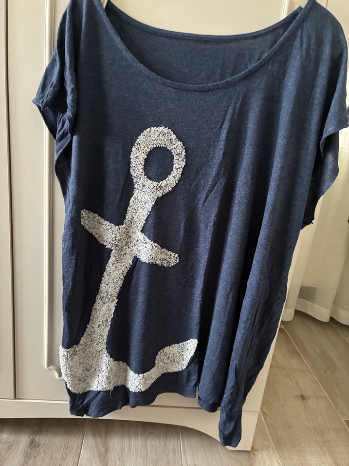 Rahat kesim, kısa kollu tişörtü. Yumuşak denim kumaştan, önünde örme gri çapa baskısı bulunur. Günlük kullanıma uygundur.
