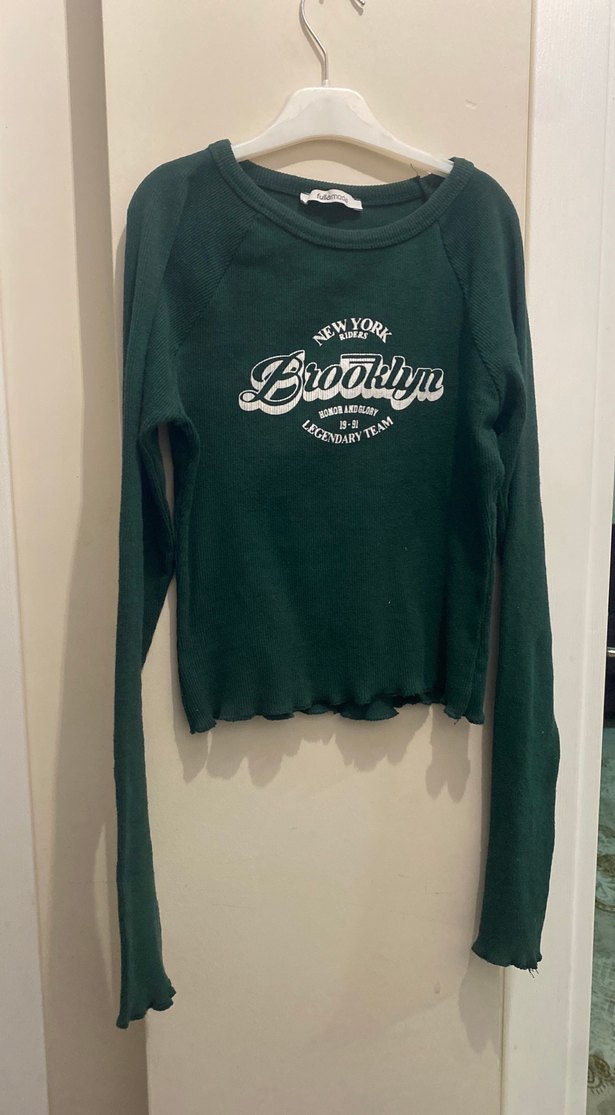 Yeşil renkli, örme kumaştan, uzun kollu ve bol kesim Brooklyn baskılı sweatshirt. Günlük kullanıma uygundur. Fulla moda likralı M bedene de olur