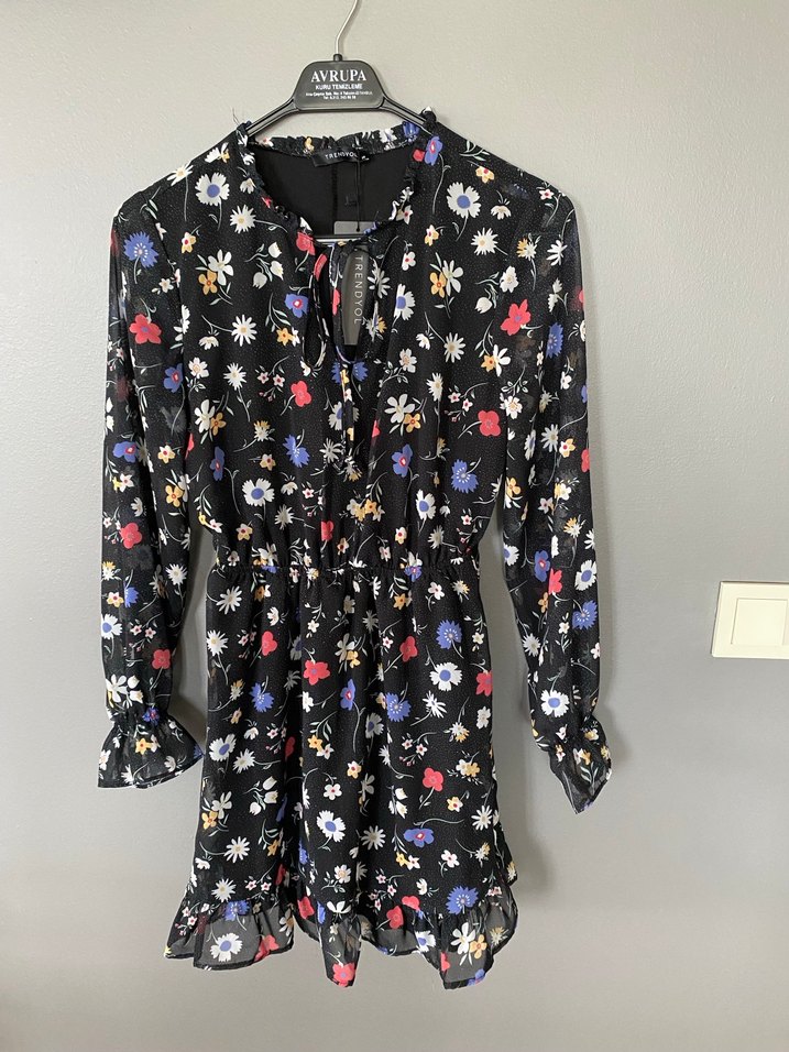 Trendyol 36 beden sıfır etiketli Çiçek desenli, uzun kollu, siyah renkli kısa elbise. Şık ve rahat kesimiyle günlük kullanım için idealdir. Kumaşı şifon ve astarlıdır ölçüleri boy:80 iki koltuk arası:46