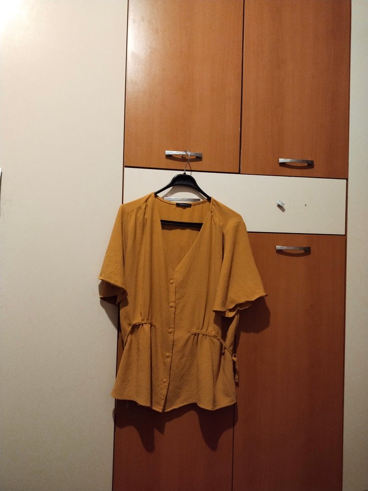## TRENDYOL## 46 BEDEN##Düğmeli önü ve V yakası olan## kısa kollu## HARDAL RENGİ##keten gömlek## Salaş kesim ve normal##midi uzunlukta## parlak yüzeye sahip rahat bir parça.##
