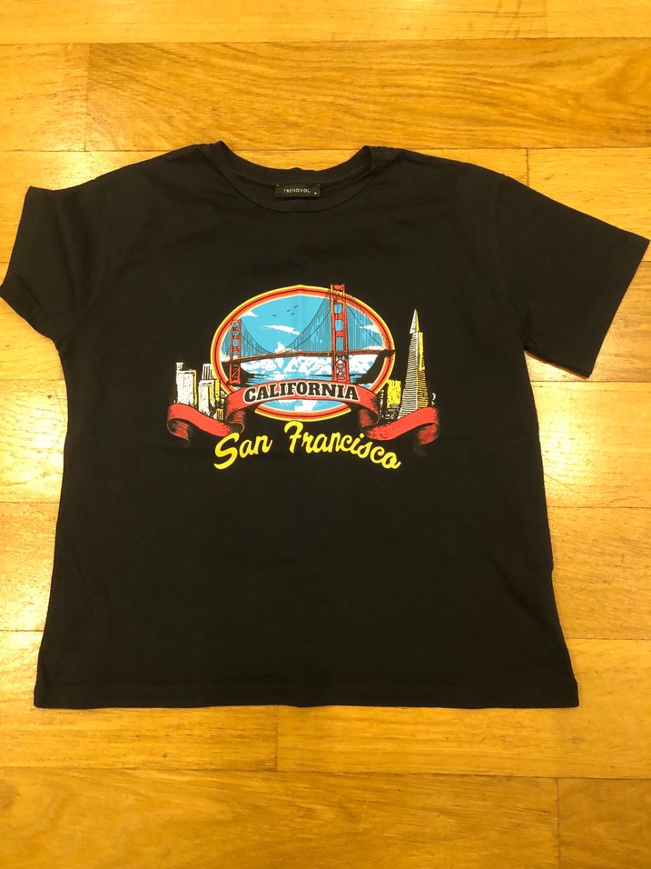 #trendyo#kız çocuk tişörtü. Kısa kollu, yuvarlak yaka ve denim kumaştan. San Francisco baskılı renkli tasarıma sahip. Ölçüleri var crop gibi..s-m