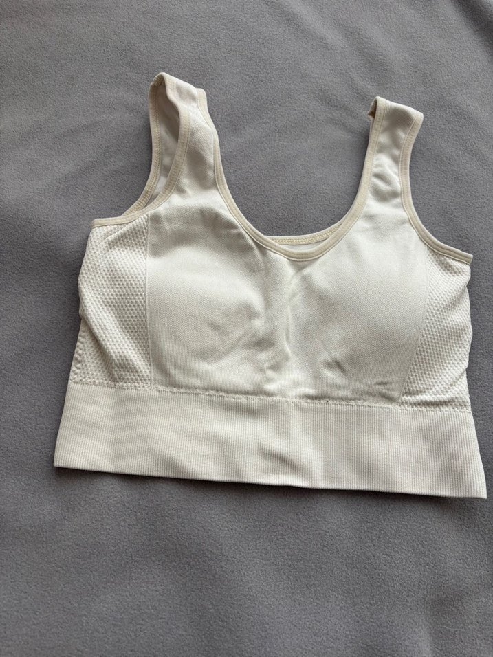 Bu beyaz spor sütyeni, desen içermeyen sade tasarımı ve midi boyu ile sokak stiline uygun. Yumuşak gri zemin kumaşı rahatlık sağlar. ️♀️