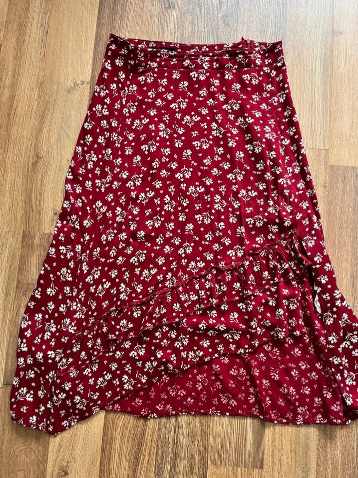 Bordo renkli, çiçek desenli uzun midi etek, bol kesim ve volan detayına sahip, yumuşak sentetik kumaştan üretilmiştir, bohem tarz için uygun.