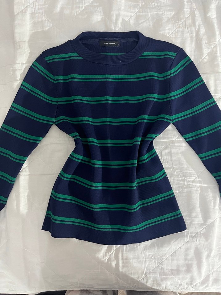 Trendyol markalı, normal midi boy, uzun kollu, yuvarlak yaka, çizgili ve fitilli örme kadın kazak. Koyu yeşil ve lacivert renkte, gündelik kullanıma uygun.Hiç giyilmedi.