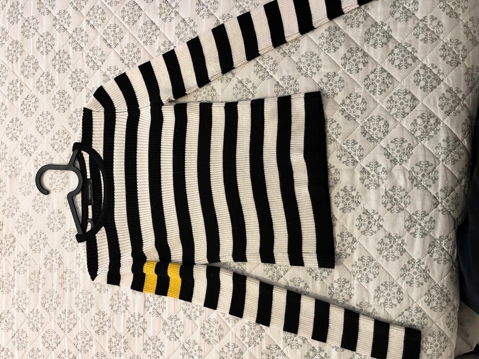 Uzun kollu, kayık yakalı, siyah beyaz çizgili ve sarı detaylı, triko dokuma kadın midi kazak. Günlük kullanıma uygun.