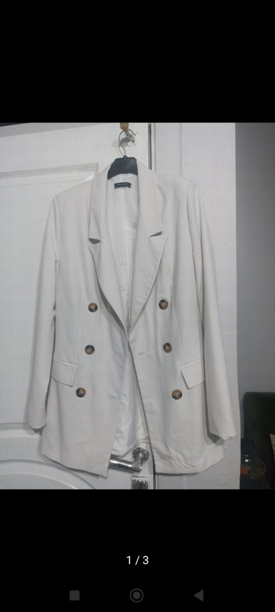 Düğmeli, beyaz renkli, keten kumaştan kadın blazer ceket. Normal boy, regular fit ve uzun kolludur. Ofis ve günlük şıklık için uygundur.