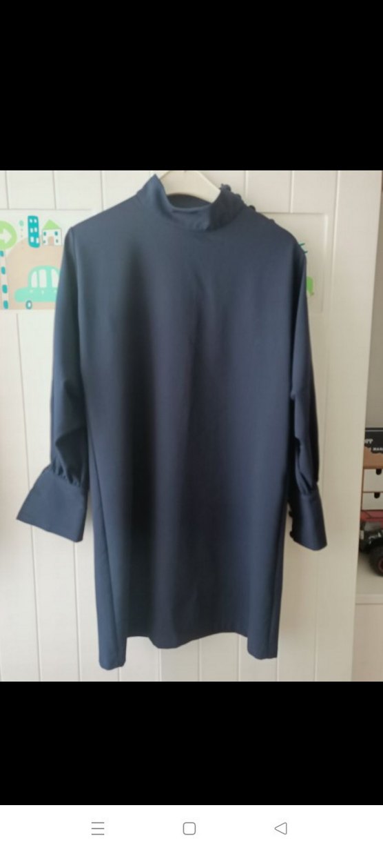 Düğmeli detaylı, uzun kollu, yüksek yakalı lacivert elbise. Regular kesim ve midi boyda, ofis için uygun.