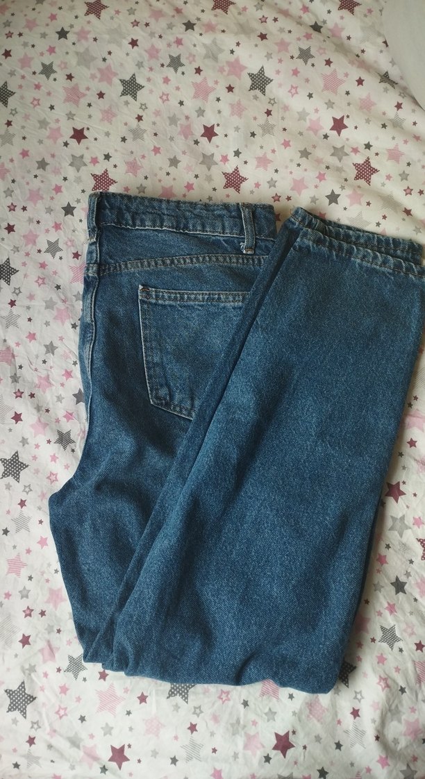 Düğmeli, rahat kesim, normal boyda pastel mavi kot pantolon, günlük kullanıma uygun.