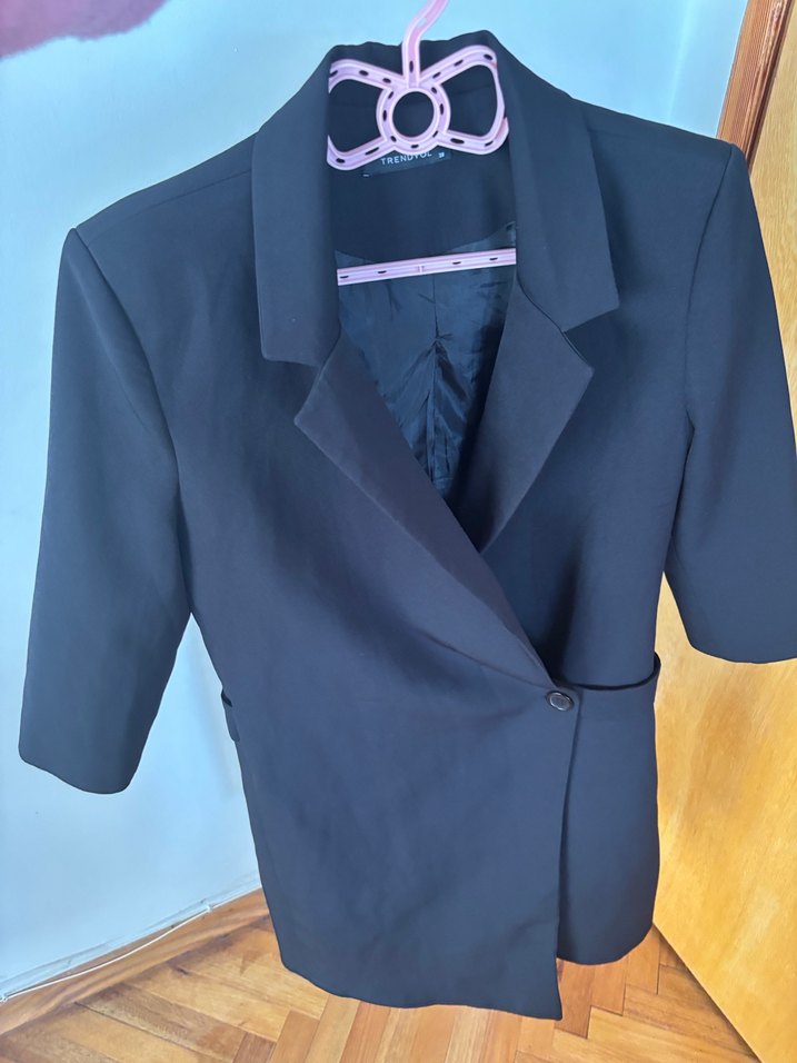Bu senenin modası Trendyol Düğmeli, notched lapel yaka ve normal kesime sahip siyah kadın elbise ceket. Midi boyda ve askılı kolludur, ofis kullanımı için uygundur.