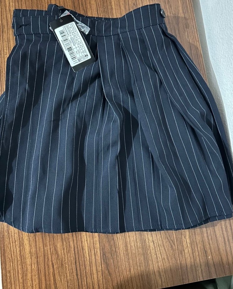 Lacivert renkli, piliseli ve çizgili midi etek.Belden sarmalı etek