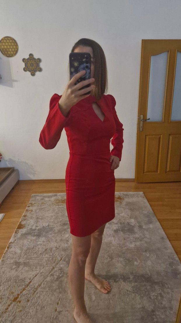 Uzun kollu, Omuzları hafif volenli, göğüs kısmı V şeklinde açık kırmızı mini elbise. Parlak dokusu ve yırtmaç detayıyla normal midi uzunluğundadır. Cesur bir görünüm sunar. ❤️ Çok canlı bir kırmızıya ve yumuşacık kumaşa sahip S M arası bedene sahip kişilere de uyar. Kalıbı normal S bedene göre birazcık daha geniş