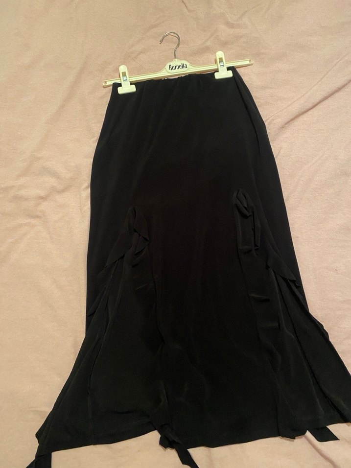Siyah uzun etek, dökümlü tasarım ve bol kesim ile ipeksi kumaştan, gotik tarzda romantik akşamlar için uygundur. sorunsuz