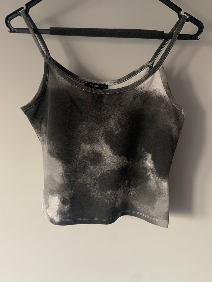 Gri batik desenli, straplez yaka ve fitted kesime sahip crop. Yumuşak sentetik kumaştan, grunge punk goth tarzında, günlük kullanıma uygun.