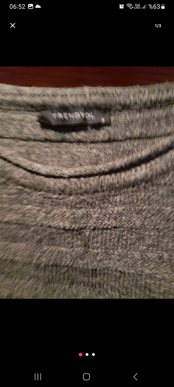 Gri renkli yün kumaştan, triko dokuma, yuvarlak yaka ve uzun kollu kadın kazak. Salaş kesim ve midi boyda, günlük kullanıma uygundur. Trendyol marka olan ürün orijinaldir ve yeni gibidir. Deforme olmamıştır. S (36) bedendir.